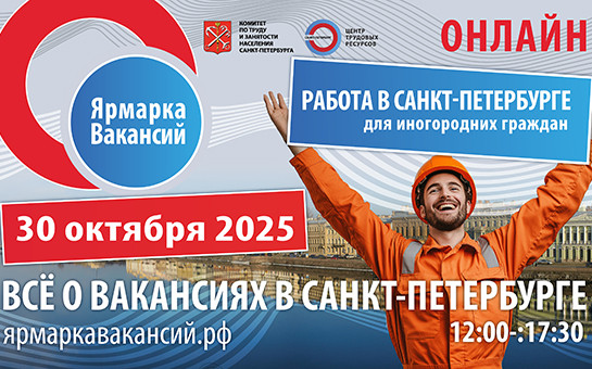 Санкт-Петербургское государственное автономное учреждение «Центр трудовых ресурсов» объявляет о проведении межрегиональной Ярмарки вакансий для соискателей из регионов Российской Федерации. Мероприятие пройдет 30 октября 2025 года в ОНЛАЙН-формате на официальной платформе ярмаркавакансий.рф.